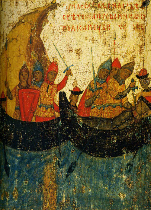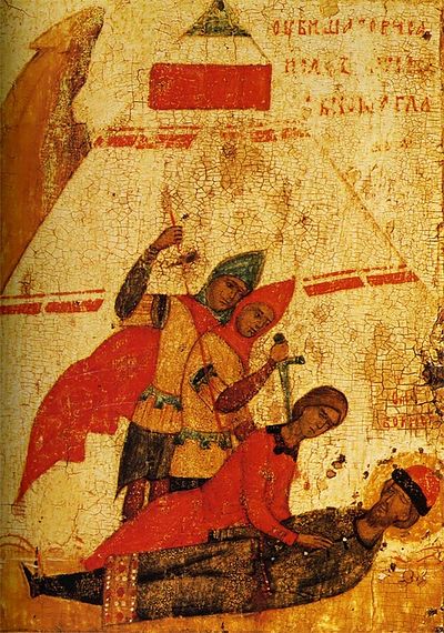 The murder of Gleb in a boat. Scene from an icon of Sts. Boris and Gleb Church in Zaprudi, Kolomna. Late fourteenth century.