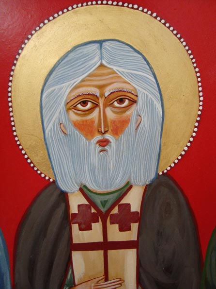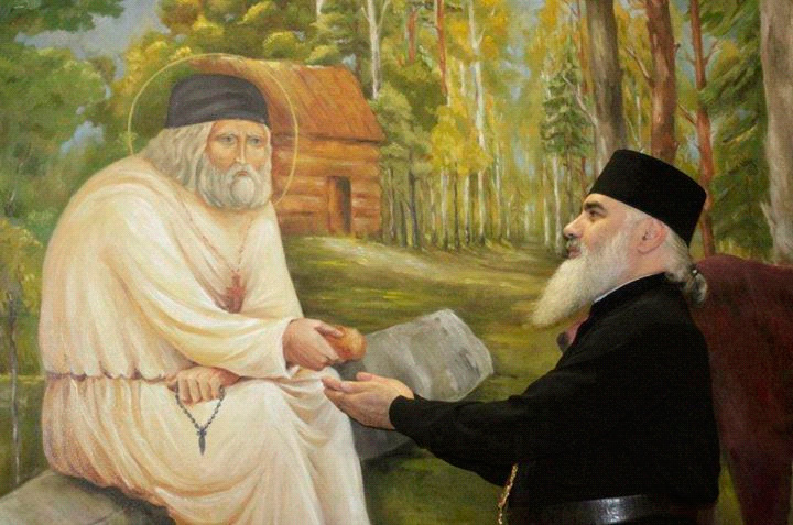 Metropolitan Seraphim (Jojua) of Borjomi and Bakuriani takes a blessing from fresco of St. Seraphim. The most popular Russian saint in Georgia is St. Seraphim of Sarov.