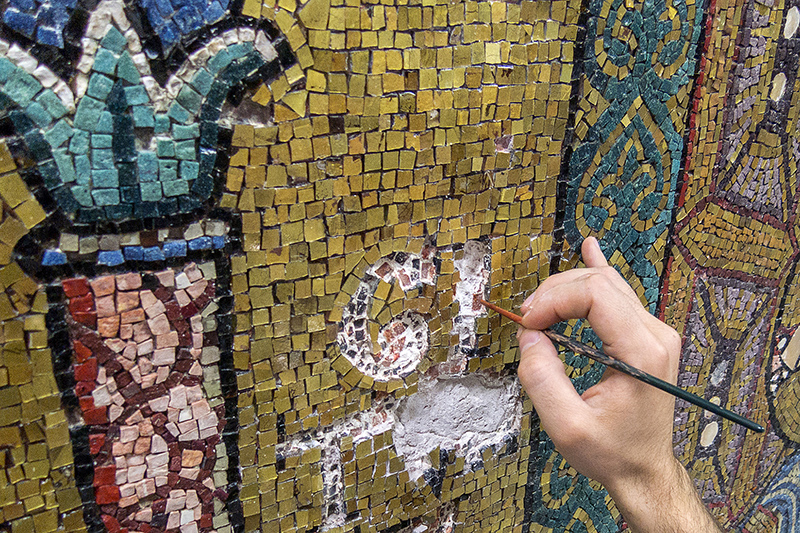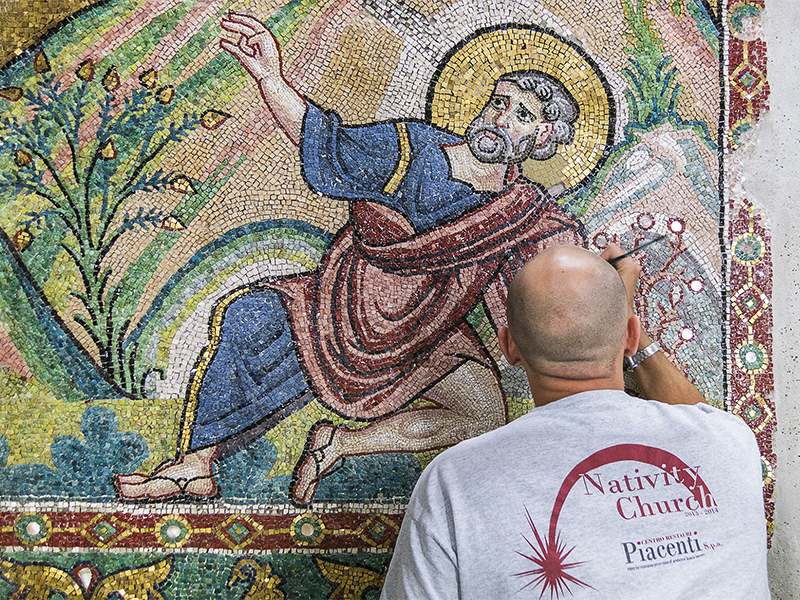 A restorer works on a wall of mosaic tiles in the Church of the Nativity in Bethlehem. Photo courtesy of Piacenti SpA