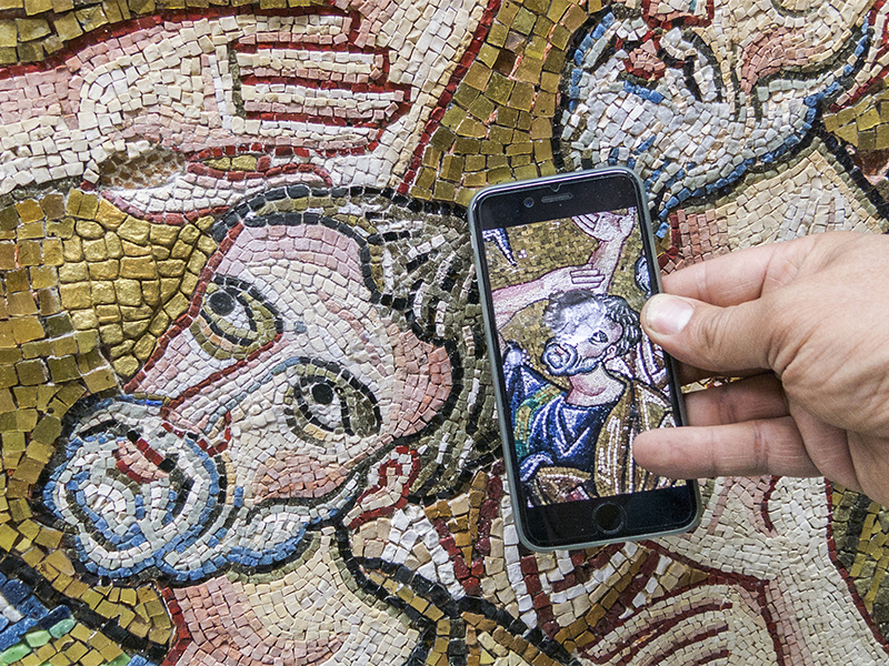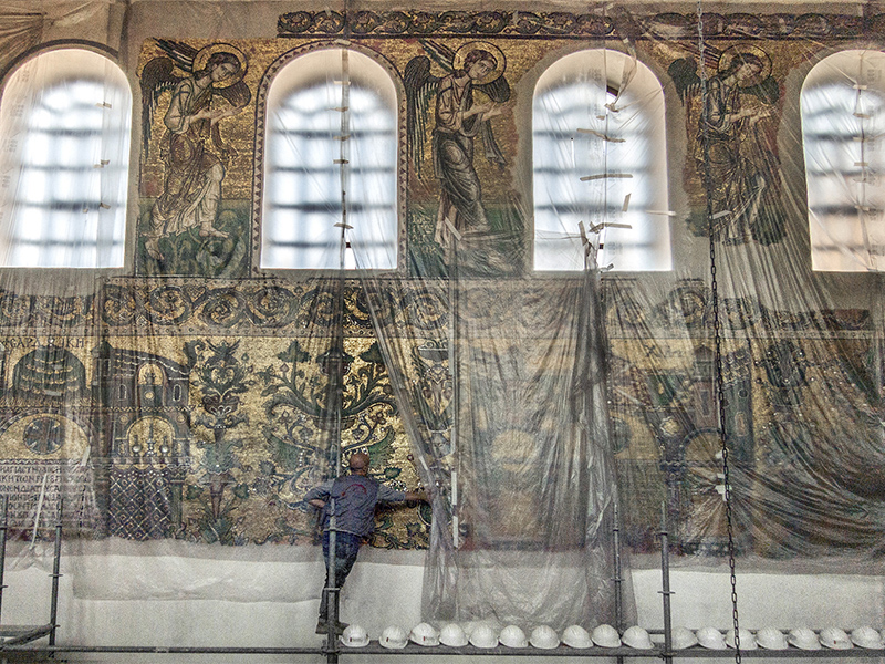 Around 170 experts have been working on the restoration of the church’s ceiling, wooden architraves and walls for the past three years. During their research, they uncovered a mosaic angel, the seventh that still remains in the church, and cleaned and restored more than a million brilliantly colored tiny mosaic tiles.