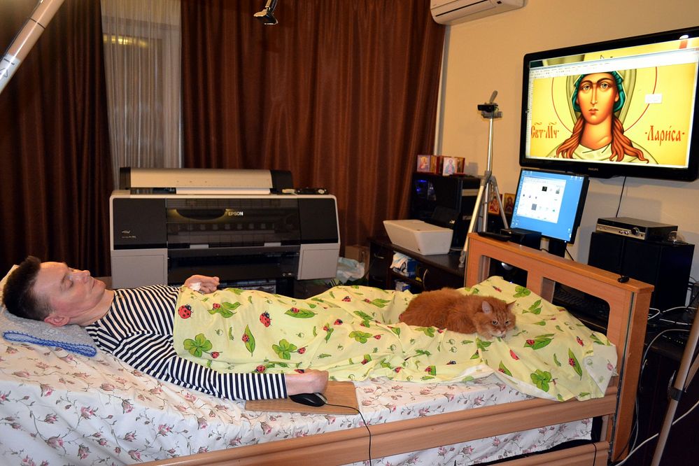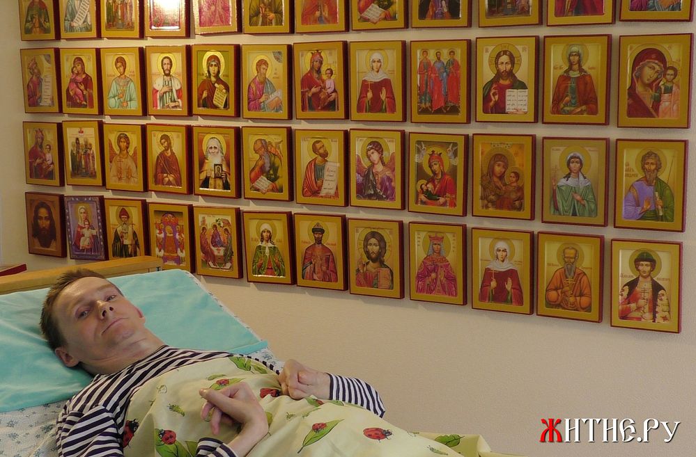 Listening to Sergei’s story, I caught myself thinking that his story shocked me to the depths of my soul. Of course it would seem so, with such a feeble body but such a powerful spirit! For us, the healthy and carefree, everything is different. It seems to me that this young man, entirely dependent on outside hep and compassion, is truly an example for us all—an example of how to live, not feeling sorry for yourself; how not to whine, overcome daily pain, and to bless God for every trial sent to us. It’s not Sergei who needed to talk to me but me who needed to communicate with him, to understand how it’s possible to live and even create, being bedridden, when life itself seems to have lost all meaning. To live, and not grumble about your circumstances. To enjoy every day, do all within our power for our neighbors… But Sergei doesn’t just live; he supports himself in life and also helps his neighbors. Caught in a difficult situation, he became a deeply believing man. After all, that he is even still alive is itself a true miracle. With such injuries as Sergei had you just don’t survive. Seven cervical vertebrae were cracked into splinters, tearing up his spinal cord. It’s the same as having your head torn off.