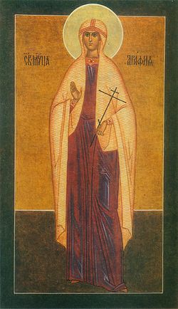 During her interrogation under Quintianus, the holy martyr was swayed neither by the flattery, nor by the threats, and she was subjected to cruel torments. They also tried to remove her breasts with metal tongs, and when this failed, they used knives.
