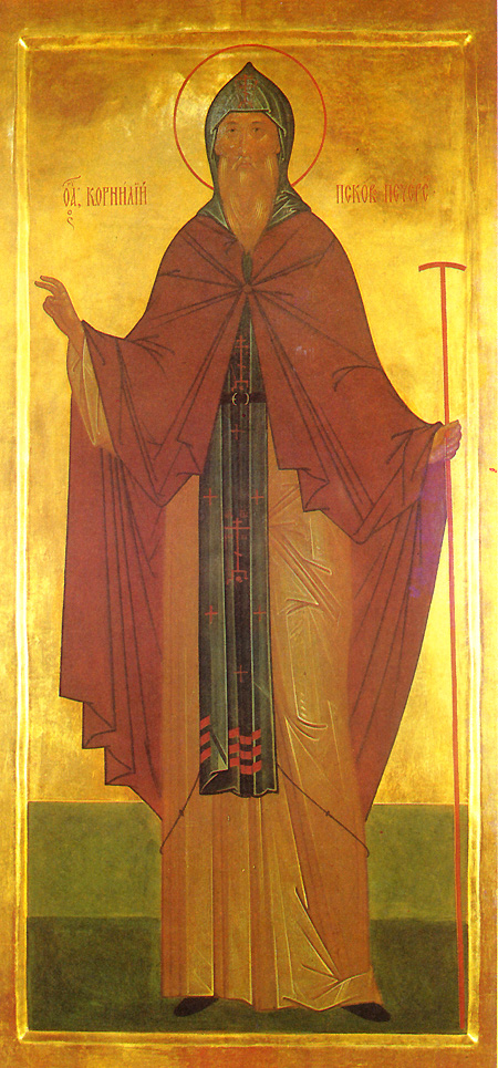 The activity of Saint Cornelius extended far beyond the bounds of the monastery. He spread Orthodoxy among the Esti [Aesti]) and Saeti people living around the monastery, he built churches, hospices, homes for orphans and those in need. During a terrible plague in the Pskov region Saint Cornelius walked through the plague-infested villages to give Communion to the living and to sing burial services for the dead.