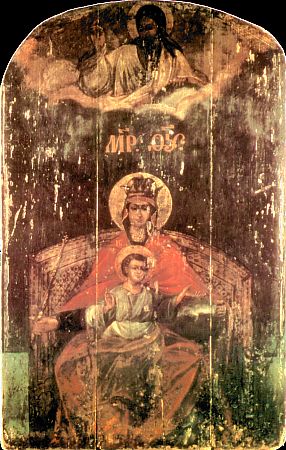 The “Enthroned” or “Reigning” Icon, which belongs to the Panachranta type, shows the Theotokos seated on a throne with Her Son.
