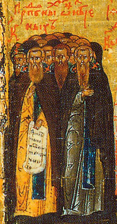 You openly disdained the pleasure of earthly and corruptible things, / choosing instead a life in the desert. / You despised the beautiful things of this world / together with the food that passes away. / Therefore, all-blessed ones, you were counted worthy of the Kingdom of heaven, / where you rejoice with the choirs of martyrs and ascetics. / As we honor your memory, / we earnestly cry out to you: / deliver us, O Fathers, from tribulations!