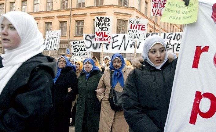 Protest by Muslims against a bill to ban the wearing of the hijab in French schools, Stockholm. Photo: Inosmi.ru
