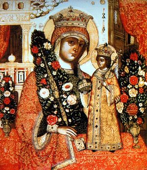 The “Unfading Bloom” Icon of the Most Holy Theotokos. On this icon the Most Holy Theotokos holds Her Divine Son upon Her right arm, and in Her left hand is a bouquet of white lilies. This bouquet symbolically signifies the unfading flower of virginity and spotlessness of the All-Pure Virgin, Whom the Church hymns: “Thou art the Root of virginity and the Unfading Blossom of purity.” Copies of this icon were glorified at Moscow, Voronezh, and other places in Russia.
