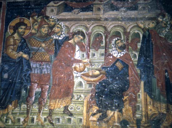 Christ Before Pilate. Pilate Washes His Hands. Fresco in the Church of St. Nicholas in Prilep, Macedonia. C. 1290. Verse 24: “So when Pilate saw that he was gaining nothing, but rather that a riot was beginning, he took water and washed his hands before the crowd, saying, ‘I am innocent of this man’s blood; see to it yourselves.’” It’s quite ironic, I think, that Pilate washed his hands and considered himself innocent of the blood of Christ when after all he’s the one to whom we attribute the death of Christ. We mention His name every time we say the Creed, that Jesus was “crucified under Pontius Pilate.” So he remains responsible, ultimately, for the death of Christ. And Chrysostom said: “They themselves had brought Christ to him in order that the crucifixion might be the result of a verdict pronounced by the governor, but just the opposite happened; He was, rather, acquitted by the verdict of the governor.” Chrysostom knows the irony. They wanted Christ crucified, they (that is, the Jewish leaders) wanted to absolve themselves of responsibility for Christ’s death, but it is the governor who proclaims his innocence and puts the responsibility for his death back on the Jews. And of course, the entire purpose of releasing the prisoner was about to be thwarted. The idea was to prevent a riot or a rebellion, but since that is exactly about to occur because the crowd is insisting upon Barabbas, Pilate decides not to press the issue and instead gives the people Barabbas. I’m sure he did not want to do that.
