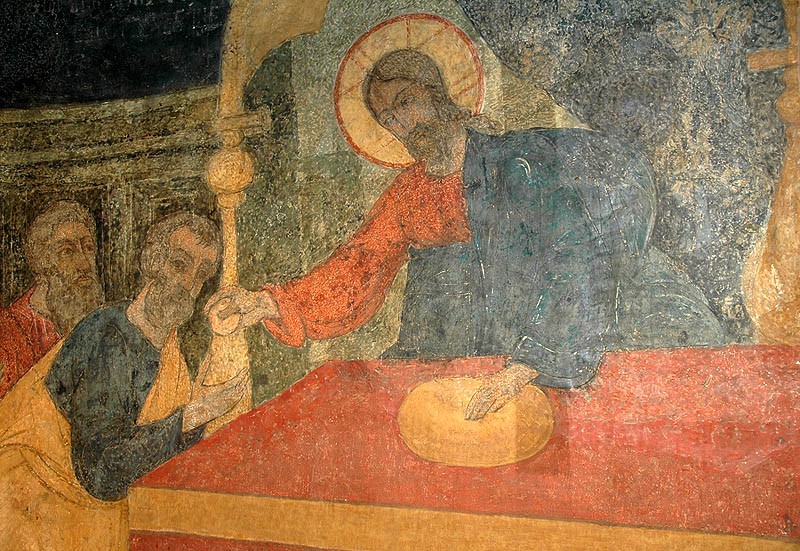 Holy and Great Thursday. The Apostles receiving Communion. Fresco in the Cathedral of the Vladimir Icon of the Mother of God, Sretensky Monastery, Moscow. O course He also says, “Do this in remembrance of me.” And people say that means it was a “memorial meal.” But He didn’t say, “Do this in remembrance of me,” but “Do this in remembrance of me”—because the Jews always remembered Moses at Passover time. They remembered their journey out of slavery in Egypt, the slavery under the Egyptians, the physical slavery, and their entrance into the Promised Land of Canaan. But Christ tells His disciples that, “from now on at Passover you will no longer remember Moses, but you will do this, celebrate the Passover, in remembrance of me, of the Christian Passover.” The Greek word “Pascha” is the word Passover. Passover is “Pesach” in Hebrew, “Pascha” in Greek. So we celebrate Passover as Christians, but not the Jewish Passover. We do not remember Moses, we remember the Christian Passover, our deliverance—not from the physical slavery in Egypt, but from the slavery of sin and death; and our entrance—not into the physical land of Canaan, but into the Kingdom of Heaven.
