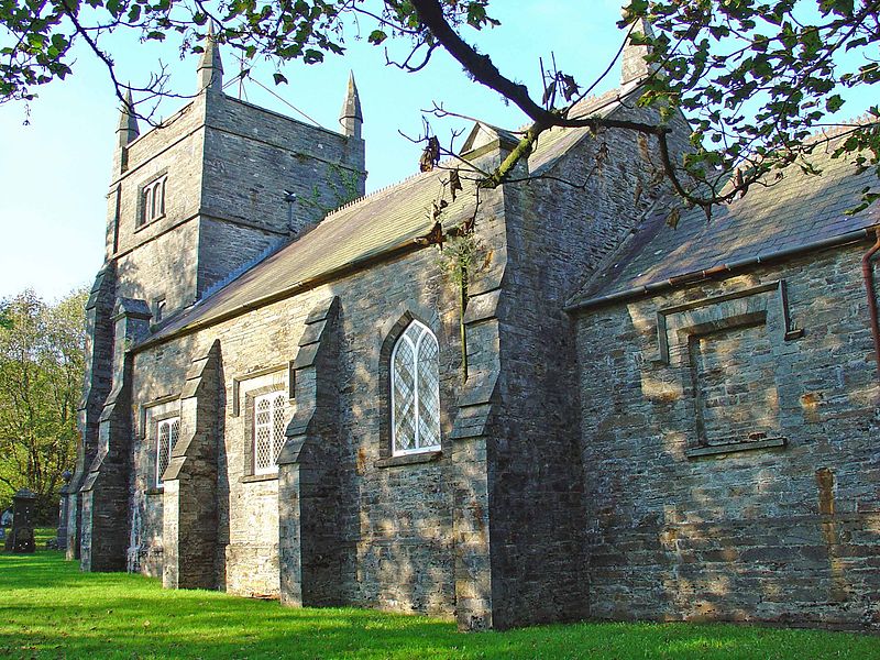 The most important church dedicated to the saint is in Nevern in Pembrokeshire, mentioned above, which was his principal center. The church sits by the river at the foot of a hill. The tower is its oldest feature and can be traced back to Norman times. The rest of the church is of the fifteenth and sixteenth centuries. There is a collection of stained glass and carved stones inside. These include the smart “Braided Cross Stone” in the south transept chapel, which has a rare relief knotwork cross, and the “Maglocunus stone”—both are over 1000 years old. The church commemorates the Welsh geologist, antiquarian and author George Owen (1552-1613) who was buried here.