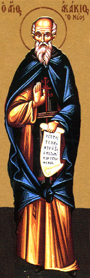 Saint Acacius the New was a monk at the Holy Trinity monastery of Saint Dionysius of Olympus (January 24) at Zagora. After visiting several monasteries on Mount Athos, the saint on the advice of his father-confessor, Father Galacteon, settled in the skete monastery of Saint Maximus the Hut-Burner (“Kavsokalyvites”, January 13), who repeatedly appeared to the ascetic.