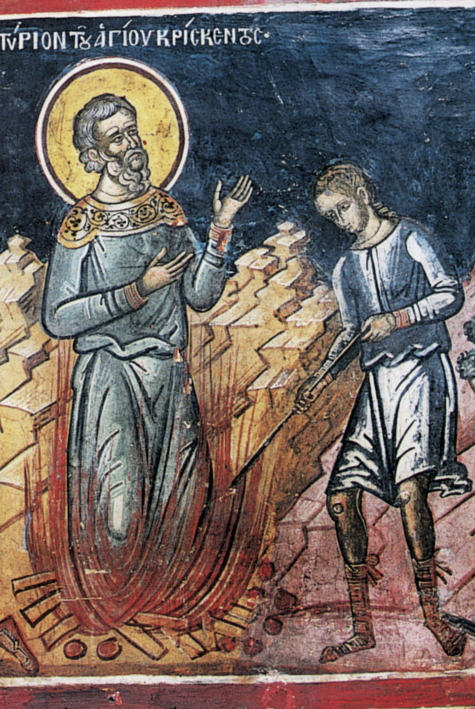 The Holy Martyr Crescens (Kreskes) was descended from an illustrious family and lived in Myra of Lycia. When a throng of city inhabitants were on the way to the pagan temple, he urged them to forsake paganism and come to Christ. This incident became known to the city prefect.