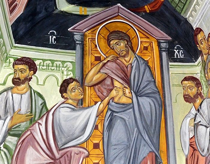The Lord appeared to the disciples after His Resurrection. When He appeared, He showed them His hands and feet as proof of His Resurrection, and did so more than once. But the apostle Thomas, who was not present with them, expressed some doubt, and responded to the words of the disciples about how they had seen the Lord, Except I shall see in his hands the print of the nails, and put my finger into the print of the nails, and thrust my hand into his side, I will not believe (Jn. 20:25).