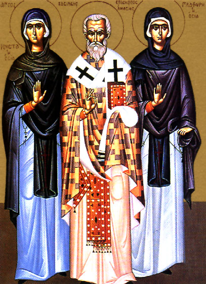 At this time the saint was building a church in the city. Saint Glaphyra donated all the money that she had received from Constantia for its construction, and in a letter to the empress she asked her to send additional funds to complete the church. The empress fulfilled her request. However, Saint Glaphyra’s letter fell into the hands of the emperor. The enraged Licinius ordered the governor of Amasea to send him the hierarch and the maidservant. Saint Glaphyra died before the edict arrived in Amasea, and Saint Basil was sent to the emperor. Two deacons, Parthenius and Theotimos, followed after him and lodged near the prison where the saint was held.