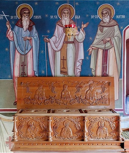 The fathers of Putna Monastery began restoring the Sihăstria Putnei Hermitage on April 24, 1990, after 200 years of closure. It was on this day that they found the relics of the Venerable Fathers Silas, Nathan, and Paisios. The tomb of the holy ascetic Silas was discovered first, on the right side of the hermitage church, with the inscription, “Here lie the bones of Hieroschemamonk Silas, who left this world on April 23, 1783.” His bones were found, yellow and beautiful underground.
