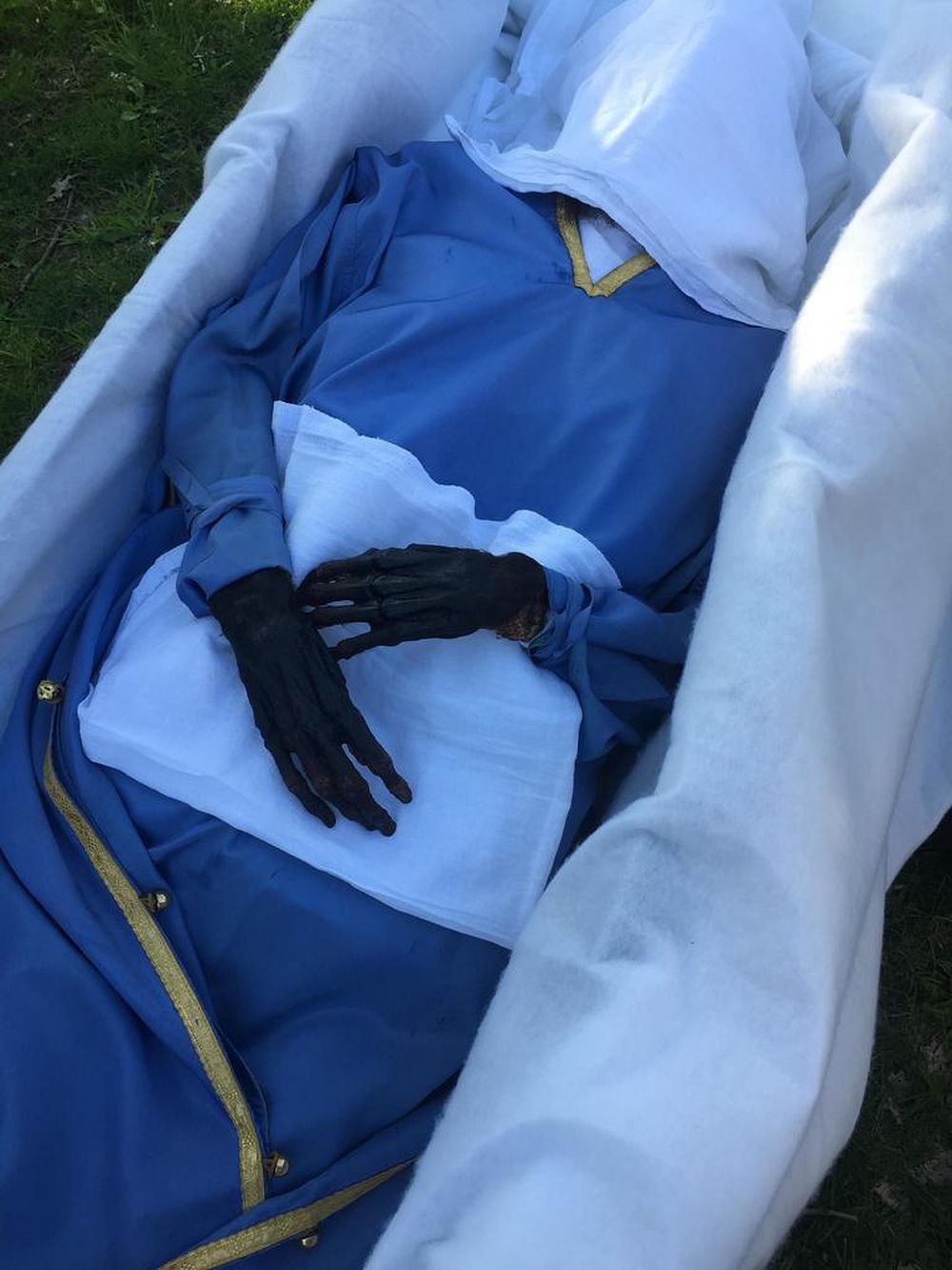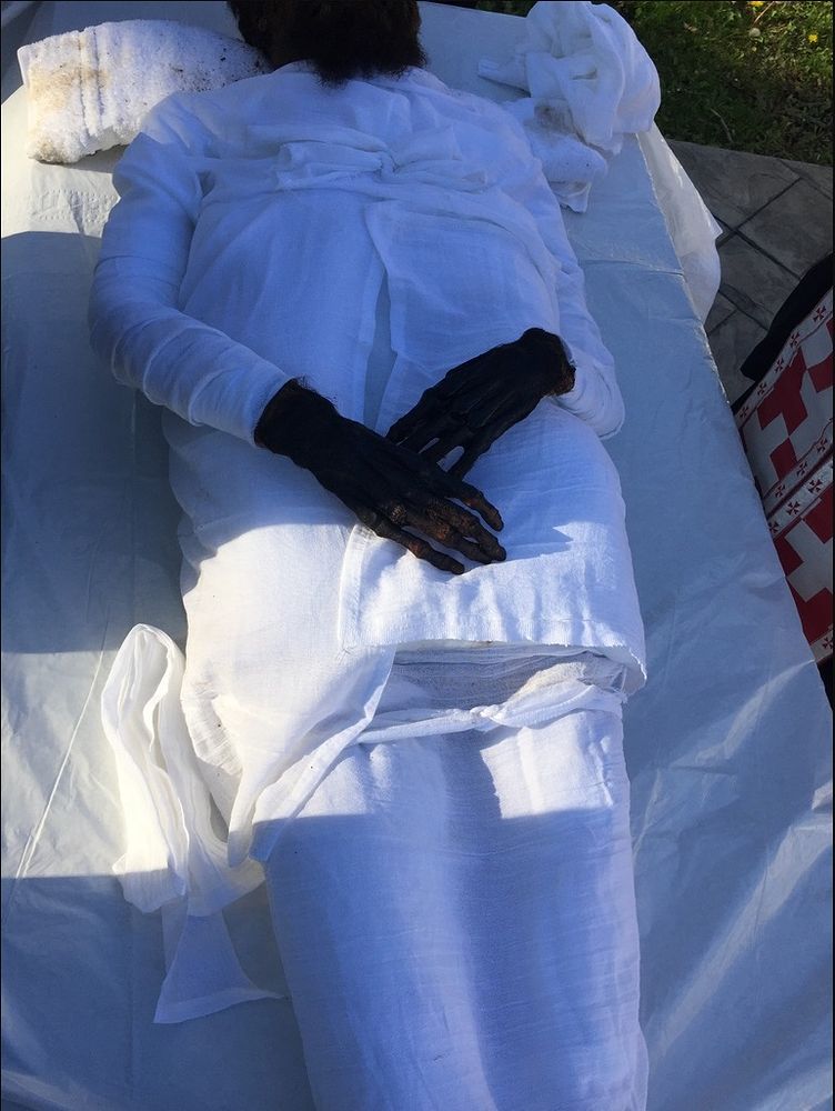 After the washing and anointing, the legs, hands and torso were all wrapped in cotton and linen, making the holy relics more easily movable. Following this process, the holy relics were temporarily vested in a stiharion until his vesting takes place before his Glorification in July 2017. His face was covered with linen, and he was returned to the temporary metal coffin and covered.