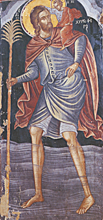 Christopher once made a vow to serve the greatest king in the world, so he first offered to serve the local king. Seeing that the king feared the devil, Christopher thought he would leave the king to serve Satan. Learning that the devil feared Christ, Christopher went in search of Him. Saint Babylas of Antioch told him that he could best serve Christ by doing well the task for which he was best suited. Therefore, he became a ferryman, carrying people across a river on his shoulders. One stormy night, Christopher carried a Child Who insisted on being taken across at that very moment. With every step Christopher took, the Child seemed to become heavier. Halfway across the stream, Christopher felt that his strength would give out, and that he and the Child would be drowned in the river. As they reached the other side, the Child told him that he had just carried all the sins of the world on his shoulders. Then He ordered Christopher to plant his walking stick in the ground. As he did so, the stick grew into a giant tree. Then he recognized Christ, the King Whom he had vowed to serve.