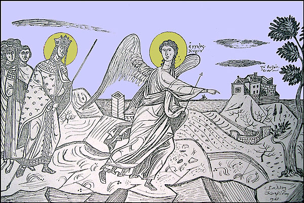 Then they understood that the emperor was being guided by some divine power. There is an iconographic sketch by Rallis Kopsides showing an angel of the Lord going before Saint Constantine as he traces the new boundaries of the city.