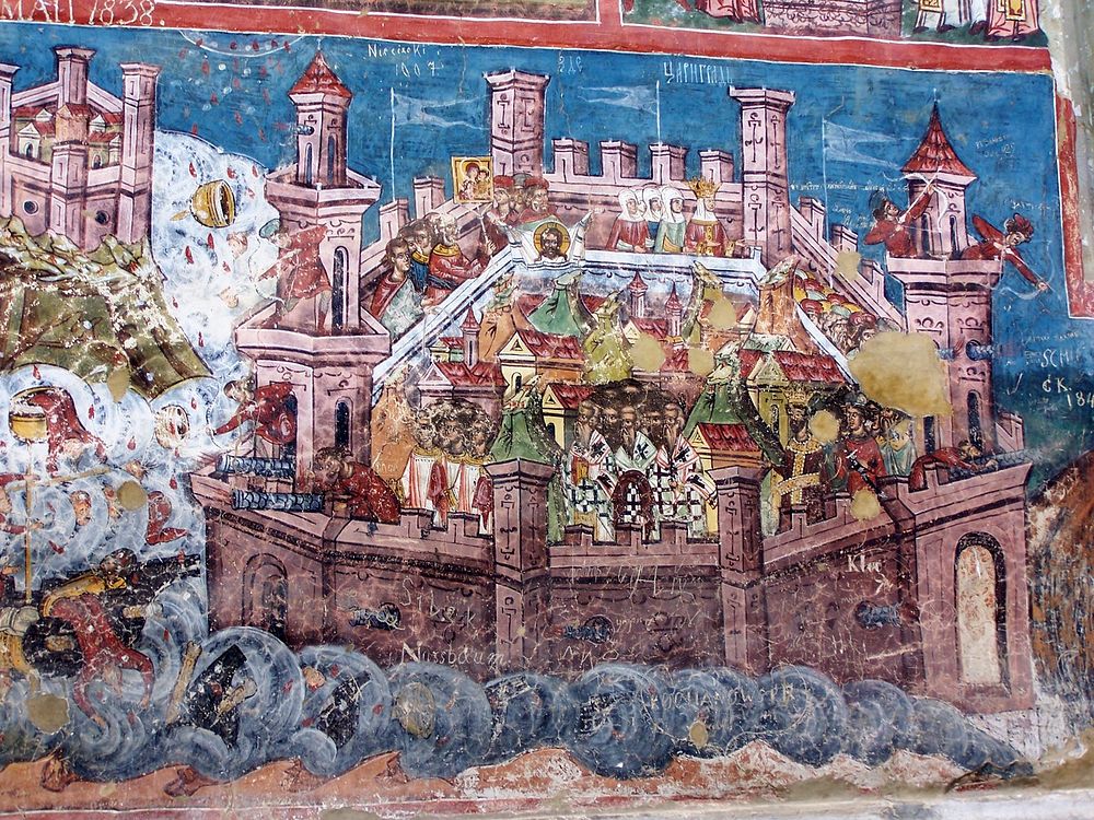 The sudden noise was horrifying. All along the line of the walls the Turks rushed in to the attack, screaming their battle-cries, while drums and trumpets and fifes urged them on. The Christian troops had been waiting silently; but when the watchmen on the towers gave the alarm the churches near the walls began to ring their bells, and church after church throughout the city took up the warning sound till every belfry was clanging. Three miles away, in the Church of the Holy Wisdom the worshippers knew that the battle had begun. Every man of fighting age returned to his post; and women, nuns amongst them, hurried to the walls to help bring up stones and beams to strengthen the defenses and pails of water to refresh the defenders. Old folk and children came out of their houses and crowded into the churches, trusting that the saints and angels would protect them. Some went to their parish church, others to the tall Church of Saint Theodosia, by the Golden Horn. It was her feast-day on the Tuesday; and the building was decked with roses gathered from the gardens and the hedgerows. Surely she would not abandon her worshippers. Others went back to the great cathedral, remembering an old prophesy that said that though the infidel might penetrate through the city right into the holy building, there the Angel of the Lord would appear and drive them back with his bright sword to perdition. All through the dark hours before dawn the congregations waited and prayed.