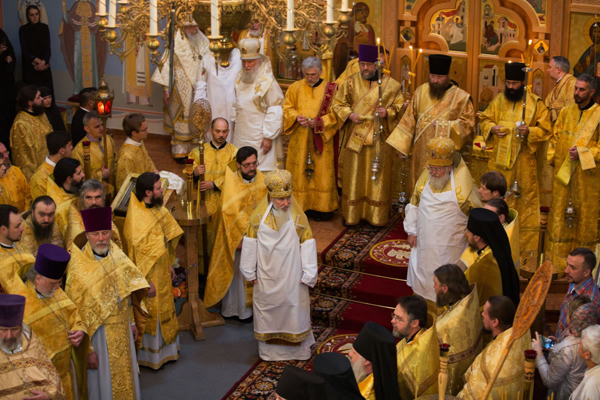 The consecration was led by His Beatitude Metropolitan Onuphry of Kiev and All Ukraine, the First Hierarch of ROCOR His Eminence Metropolitan Hilarion of New York and Eastern America, and His Eminence Archbishop Mark of Berlin and Germany, and concelebrated by 16 other hierarchs from ROCOR and the Sister Churches of Romania, Serbia, and the Czech Lands and Slovakia, as well as His Grace Bishop Tikhon (Shevkunov) of Egorievsk of the Russian Orthodox Church. The hierarchs were also joined by about 60 clergy from the German Diocese and other dioceses of the Russian Orthodox Church, and representatives of other Local Churches.