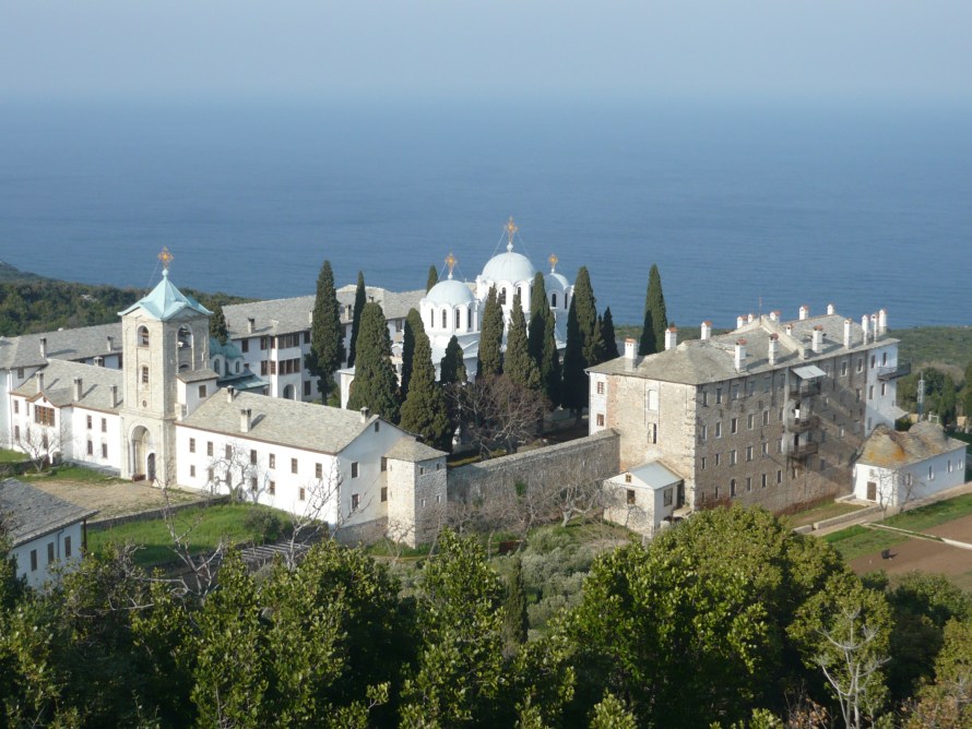 Prodromou Skete is one of two Romanian establishments on the Holy Mountain (the other being Lakkoskiti), belonging to the Great Lavra Monastery. It is located in the eastern extremity of the mountain. Romanian monastics initially received a blessing and the necessary documents to found the monastery in 1820, although its progress was interrupted by the Greek Revolution. Two Romanian monks bought the Prodroumou cell back from the Greeks in 1851, and the building of the skete’s church began in 1857. It is currently home to 25 monks, according to Wikipedia.