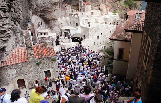 Turkey allowed the Divine Liturgy to be served on the feast in the monastery for the first time since the nation’s creation in 2010, in an effort to improve the country’s record on religious tolerance and boost tourism. During the service, His All-Holiness stated, “After 88 years, the tears of the Virgin Mary have stopped flowing.” At least 1,500 pilgrims, including people from Greece and Russia, traveled to the Byzantine-era monastery. The service was the first Orthodox Liturgy to be held at the sacred site since 1923.