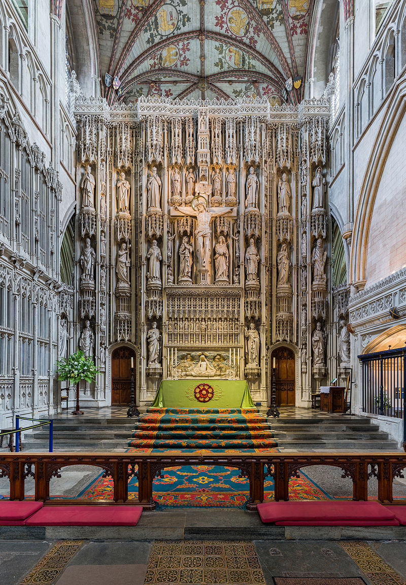 The formerly whitewashed and subsequently rediscovered exquisite thirteenth-fourteenth century wall paintings and murals depict crucifixions, many scenes and aspects of the Savior’s life and Passion, scenes from the life of the Mother of God, with shields of many early English saints. Among the best-known paintings are those of Christ in majesty and the incredulity of Apostle Thomas. The sixty-six panels of painted ceiling of the choir and the presbytery’s painted ceiling are superb. The north choir aisle contains a replica of the unique fourteenth-century astronomical clock, created by Abbot Richard Wallingford. After the Reformation, the statues of saints by the fine fourteenth-century screen of the high altar were beheaded or smashed, and it was only in the 1890s that it was decided to carve and install new statues of apostles and early English saints in their place. A prominent feature of the cathedral is the twelfth-century marble altar table in the north transept—a survival from the old abbey; the altar is now uniquely dedicated to the persecuted Church, uniting St. Alban with all other martyrs throughout the history up to our times.