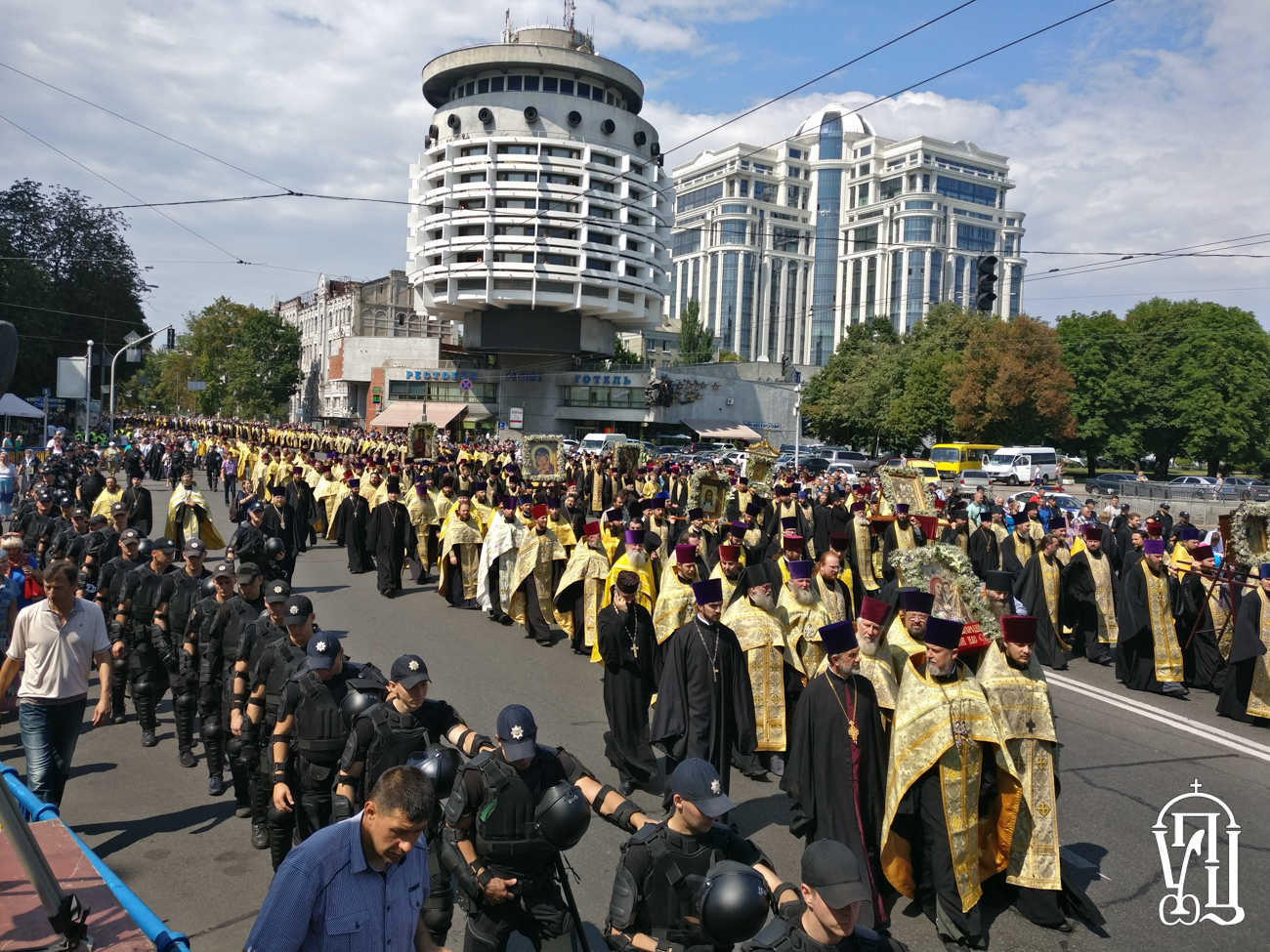 The tens of thousands gathered began the procession from Vladimir Hill headed for the Kiev Caves Lavra, following the celebration of the moleben on the hill. The procession is being led by Met. Onuphry along with the other bishops and clergy present, accompanied by the miraculous icons.