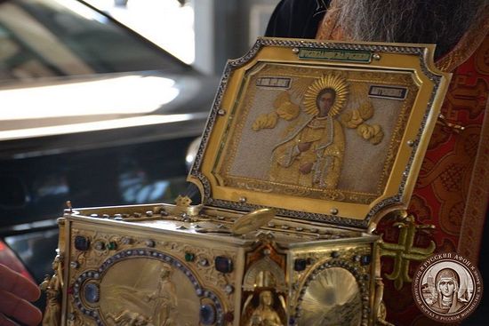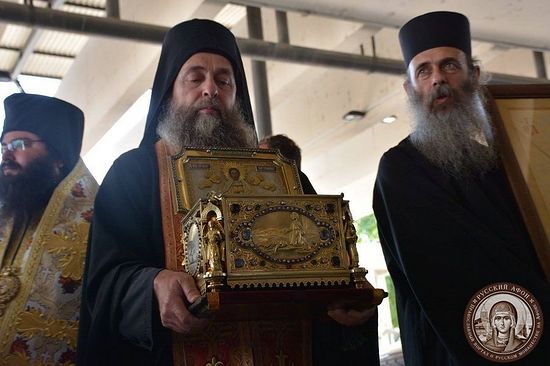 This great Athonite relic is being accompanied by the abbot of St. Panteleimon’s Archimandrite Evlogy, along with Hieromonks Seraphim and Nicholas.