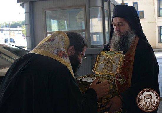 The head of the great saint was greeted at noon as it crossed the Greek-Bulgarian border by Metropolitan Seraphim (Dinkov) of Nevrokop and Bishop Gerasim (Georgiev) of Melnik, the head secretary of the Holy Synod of the Bulgarian Orthodox Church. The gathered hierarchs and clergy prayed before the relic, after which it was venerated by the border guards and taken to the capital city of Sofia.