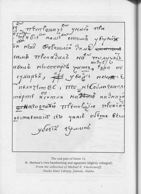 Fr. Herman’s own handwriting and signature. From the collection of Michael Z. Vinokouroff, Alaska State Library, Juneau, Alaska. By the grace of the Most High God and thanks to your holy prayers, we have safely reached the American territories, all ten men. The briefness of time does not allow me to describe such a great voyage in detail. Nearly the whole year was spent travelling. We did not meet with any adventures worth recording, although some impressed themselves by reason of the novelty of the place and the varied forms of travel. For the sake of conversation, you can tell those who are curious for news that while travelling on horseback along the Okhotsk road, we were attacked by bears. And on the ocean we saw several kinds of sea animals: whales, dolphin, sea otter, elephant seals and others of which we spotted quite a number. There have been no big storms except one.