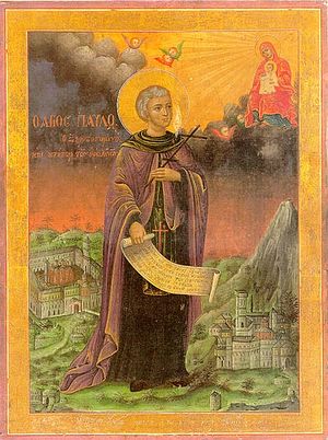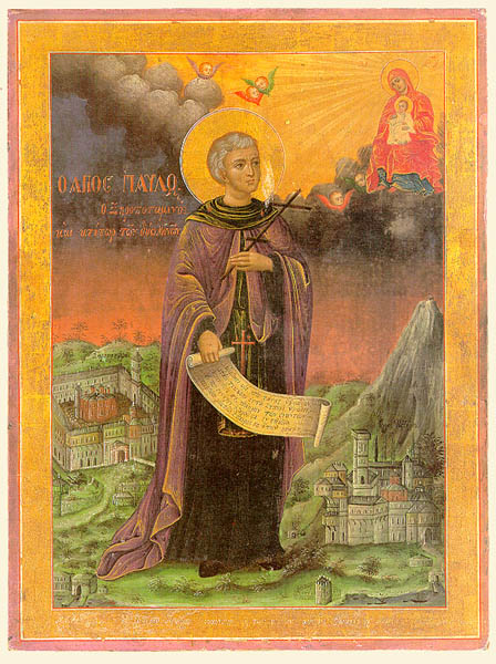 Saint Paul of Xeropotamou, in the world Procopius, was the son of the Byzanatine Emperor Michael Kuropalatos, who later resigned the imperial office and became a monk in a monastery he built. Having received the finest education, Procopius became one of the most learned men of his time. His “Discourse on the Entrance of the Most Holy Theotokos into the Temple,” the “Canon to the Forty Martyrs”, the “Canon to the Venerable Cross” and other works gained him great renown. But worldly knowledge and honors did not interest him. He exchanged his fine garb for beggar’s rags, and he went to the Holy Mountain [Athos], to Xeropotamou. He built a cell there at the ruins of an old monastery founded by the empress Pulcheria in honor of the Forty Martyrs (March 9). From Cosmas, a hermit, he received monastic tonsure with the name Paul.
