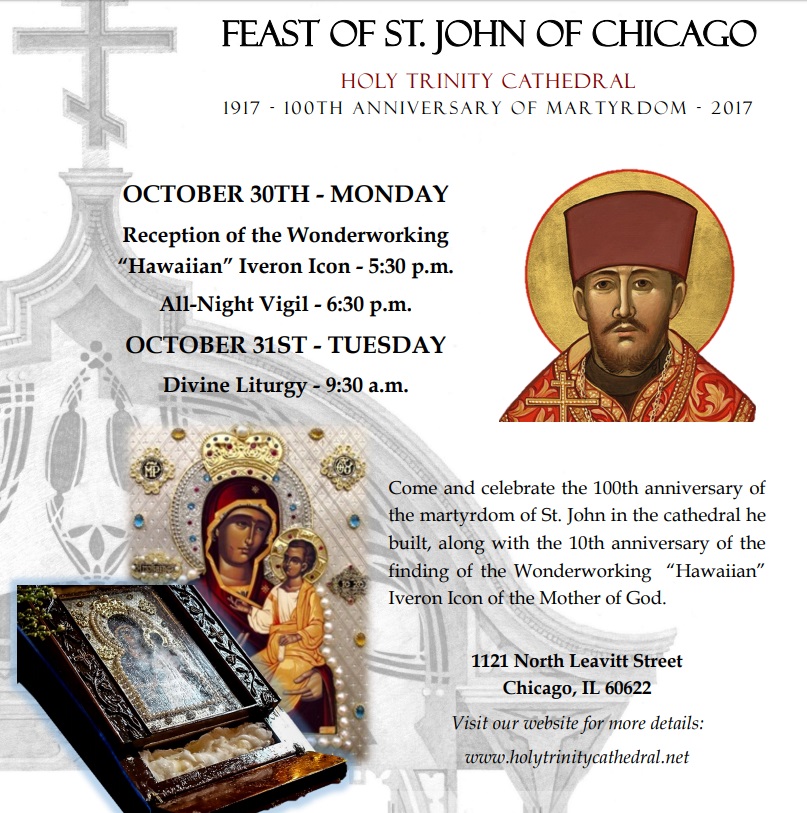 On Sunday, October 1, a Service of Thanksgiving was served, thanking God for all the blessings of the cathedral. On October 14 and 15, the cathedral will participate in Open House Chicago and anticipates hosting thousands of visitors. On Friday, October 20, Matins for the Departed will be celebrated at 6:30p.m., while on Soul Saturday, October 21, services will be held remembering all parishioners who have departed this life. Divine Liturgy will be celebrated at 9:30a.m. On October 22 at 1:00 p.m., Dr. Lisa Gassin, PhD, Professor of Psychology at Olivet Nazarene University, will present a lecture on the work of Saint John and those he worked with during his missionary days in Chicago.