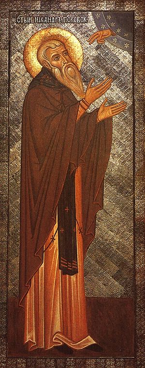 After several years of silence and severe ascetic deeds, emaciating his flesh, Nikon went to the monastery founded by Saint Sava of Krypetsk. The igumen, seeing his weakened body, would not agree to accept him at once, fearing that the difficulties of monastic life would be too much for him. Nikon fell down at the crypt of Saint Sava, and spoke to him as if to one alive, entreating him to take him into his monastery. The igumen relented and tonsured Nikon with the name Nicander.