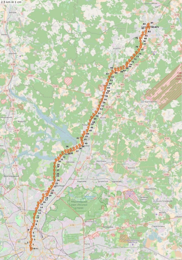 According to znanietrail.ru, some of the main attractions along the route include Christ the Savior Cathedral, Ostankino and VDNX parks, a botanical garden, Holy Protection Church in Medvedkovo, a memorial park to Tsar Nicholas II, the Klyazma, Ucha, and Vorya Rivers, the memorial cross in honor of Sts. Sergius of Radonezh and Seraphim of Sarov in Sofrino, and the Trinity-St. Sergius Lavra, and much more.
