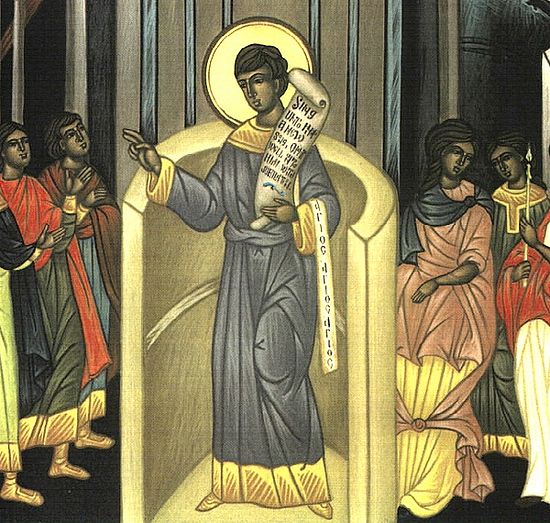That evening at the all-night Vigil Saint Romanus sang, in a wondrous voice, his first Kontakion: “Today the Virgin gives birth to the Transcendent One...” All the hymns of Saint Romanus became known as kontakia, in reference to the Virgin’s scroll. Saint Romanus was also the first to write in the form of the Oikos, which he incorporated into the all-night Vigil at his places of residence (In Greek, “oikos”).