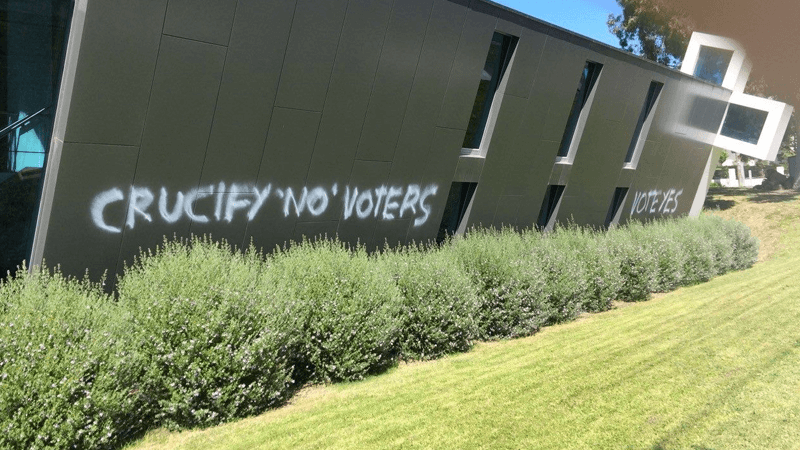 Graffiti on Waverly Baptist Church in Melbourne reads, “Crucify ‘No’ Voters. Vote Yes.”