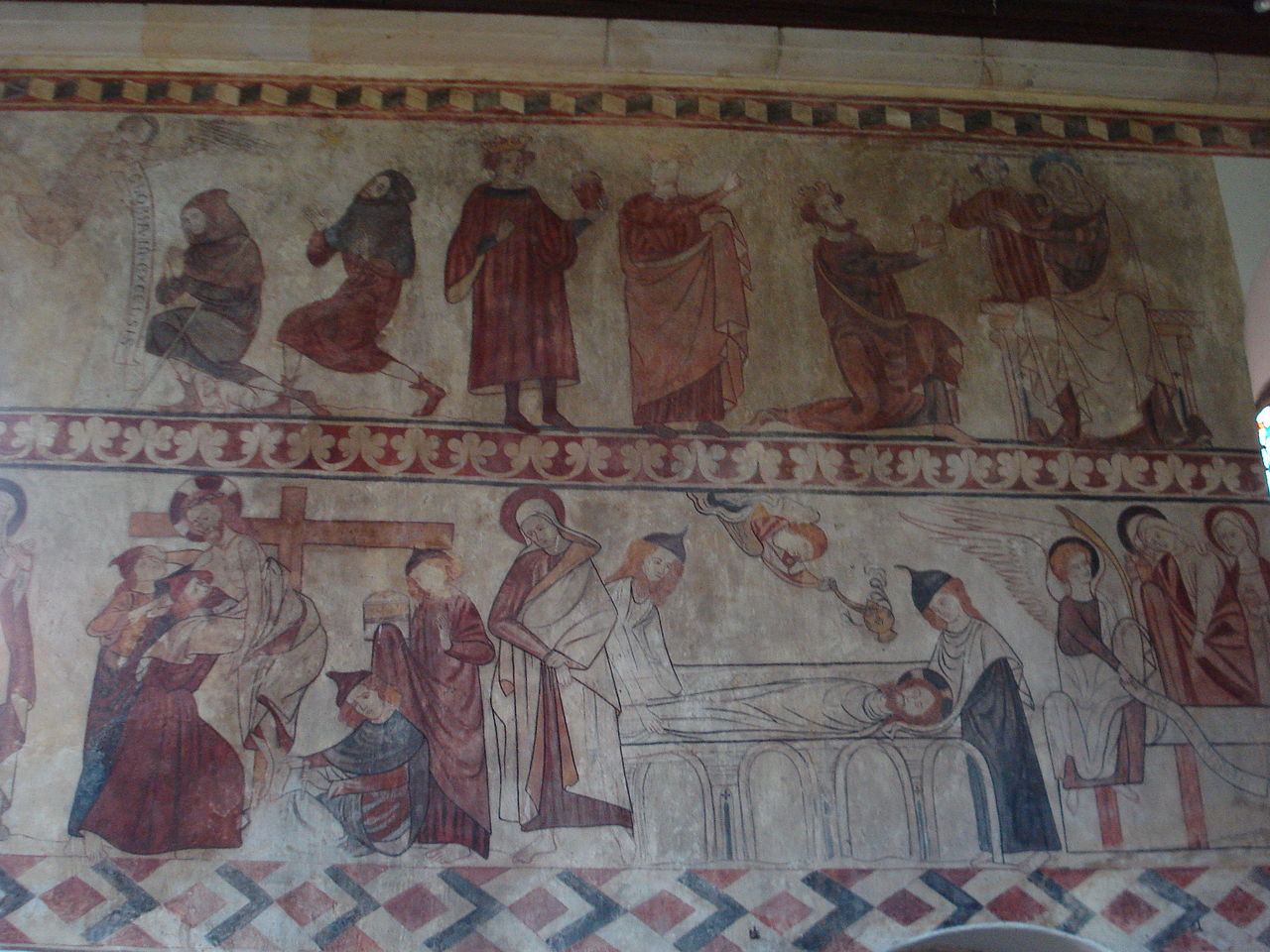 The village of Easby in North Yorkshire preserves the ruins of a medieval Premonstratensian abbey that once housed a relic of the Holy Martyr Agatha of Sicily along with a little but active parish church of St. Agatha, built at the beginning of the twelfth century. The church houses a replica of the exquisite Saxon preaching cross whose fragments were incidentally discovered built into a church wall in the last century. Now the original is kept at the Victoria and Albert Museum in London. The surviving sections depict Christ in Majesty, the apostles and other scenes. Paulinus baptized the Northumbrians in the river behind the church and perhaps built a church here, though the present structure is Norman and later. The church cross may be somehow connected with Paulinus or even created in honor of him. The church also preserves a set of exceptional rare thirteenth-century wall-paintings depicting Adam and Eve, the Fall of Man, the Nativity, the Annunciation, the Deposition of Christ from the Cross and the Women by Christ’s empty tomb.
