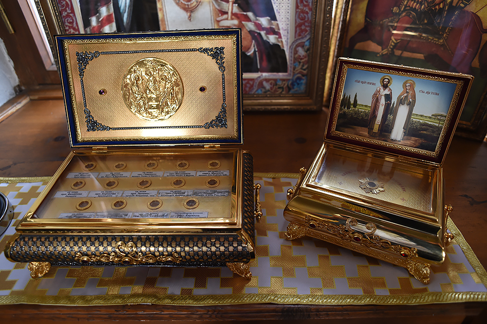 Holy objects: a Tikhvin icon of the Mother of God; icons of St. John the Baptist and St. Spiridon of Tremithus with tiny portions of their relics; reliquaries with particles of the relics of Sts. Nicholas the Wonderworker, George the Victorious, Alexis the Man of God, Job of Pochaev, and the Hieromartyr Cyprian; three reliquaries with particles of the relics of different saints.