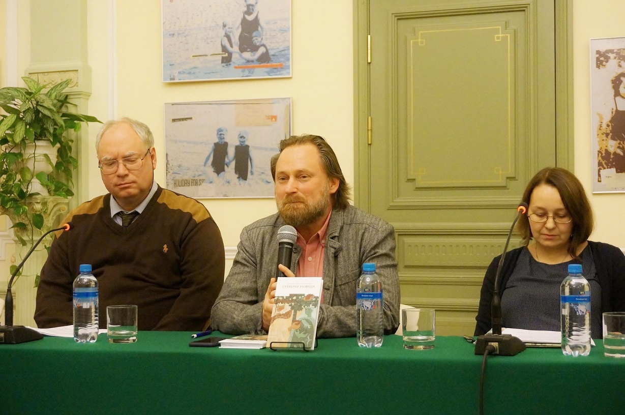 A panel discusses the publication of the Russian translation of The Superstition of Divorce. Adam Strock is seated on the left. —Please give us some background on your work—on the topic of the book, and on the process of translating, editing, and getting it into print.