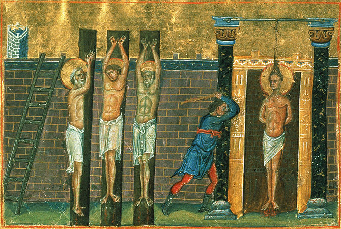 The Martyrs Claudius, Asterius, Neones and Theonilla of Aegae in Cilicia suffered for Christ in the year 285 during the reign of the emperor Diocletian (284-311). After their father’s death, the stepmother, who did not want to give the children their inheritance, betrayed them to the persecutors of Christians. The governor of Cilicia, who was named Licius, urged the martyrs to renounce Christ and instead to worship idols, and he employed various means of torture. They crucified the unyielding brothers, and Saint Theonilla was thrown into the sea after torture.