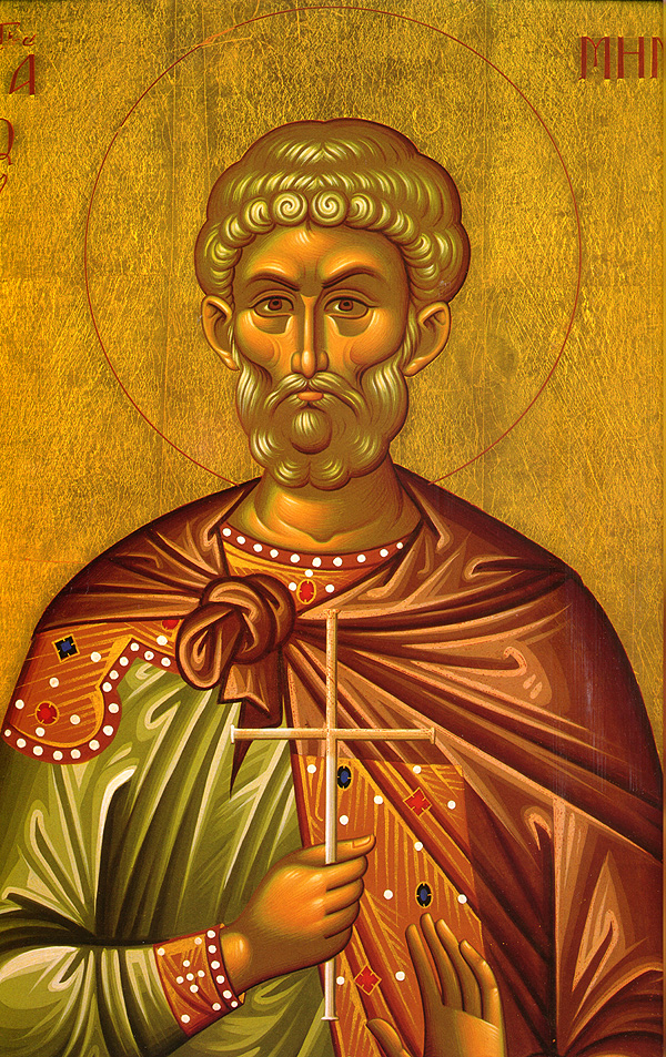The Holy Great Martyr Menas of Egypt, an Egyptian by birth, was a military officer and served in the Kotyaeion region of Phrygia under the centurion Firmilian during the reign of the emperors Diocletian (284-305) and Maximian (305-311). When the emperors began the fiercest persecution against Christians in history, the saint refused to serve these persecutors. He removed his soldier’s belt (a sign of military rank) and withdrew to a mountain, where he lived an ascetic life of fasting and prayer.
