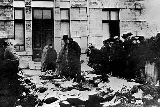 At the very time when in the holy temples there was being sung, “Let us embrace one another and say ‘brother’ even to those who hate us...” yes at that very time, outside the church walls, a drunken, beastly mob broke into Jewish homes, robbing the peaceful inhabitants and tearing human beings into pieces. They threw their bodies from windows into the streets and looted Jewish stores. A second crazed, greed filled mob rushed in to steal the clothing and jewelry from the bloodied corpses, seizing everything they could lay hand on. Like Judas, these robbers enriched themselves with silver drenched in blood—the blood of these hapless human sacrifices!