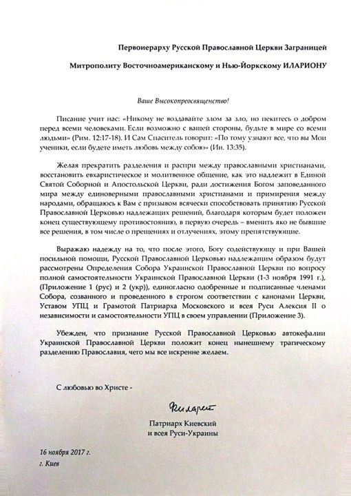 In the letter, “Pat.” Philaret speaks of the need for Ukrainian autocephaly in order to heal the Church schism there.