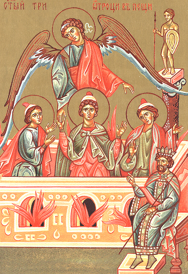 You did not worship the graven image, / O thrice-blessed ones, / but armed with the immaterial Essence of God, you were glorified in a trial by fire. / From the midst of unbearable flames you called on God, crying: / Hasten, O compassionate One! / Speedily come to our aid, / for You are merciful and able to do as You will.
