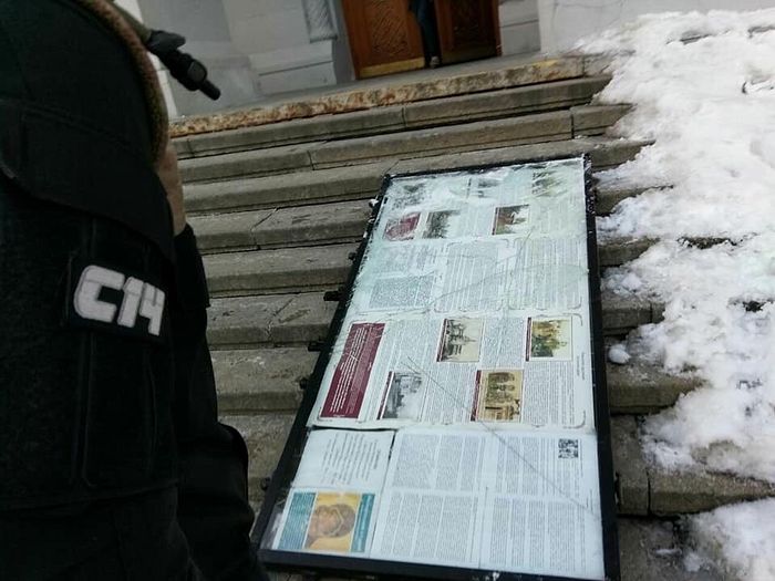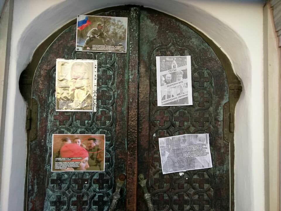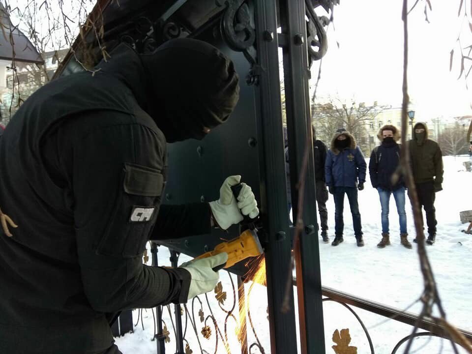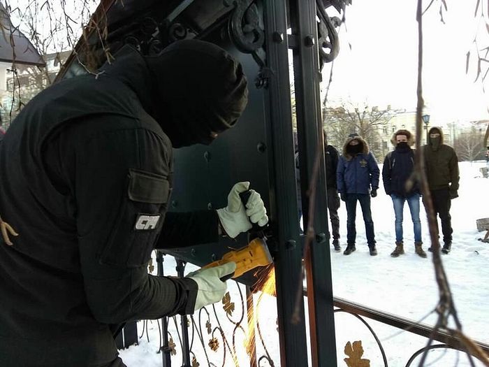 Later, in the afternoon, radicals from the groups C-14, Tradition and Order, and Falcon made a second attack on the monastery. The thugs, some of whom had covered their faces with masks, cut the metal structure around the monastery’s and posted cards on the monastery walls with misinformation about the Ukrainian Orthodox Church. Several passers-by noticed the vandalism underway and protested, to which the radicals responded with verbal abuse.