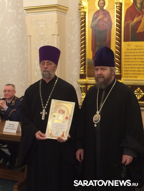 The gramota was given by Bishop Irinarch of Krasnogorsk, the Chairman of the Moscow Patriarchate’s Synodal Department for Prison Ministry to the assistant of the regional head of the Federal Penal Ministry for work with believers Vadim Konyaev, to be given to Zhilenkov.