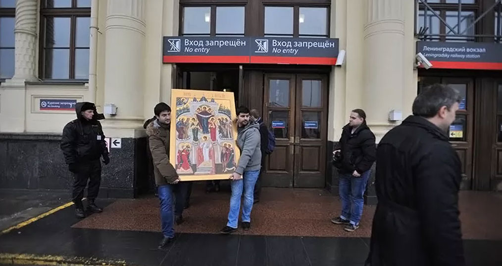 An icon of the Holy Protection of the Mother of God being carried out of a train station after a previous year's moleben. Photo: Foma.ru Annual prayers for peace and the safety of travelers will be held at Moscow train stations next Monday before the wonderworking Softener of Evil Hearts Icon of the Mother of God, reports the journal Foma.