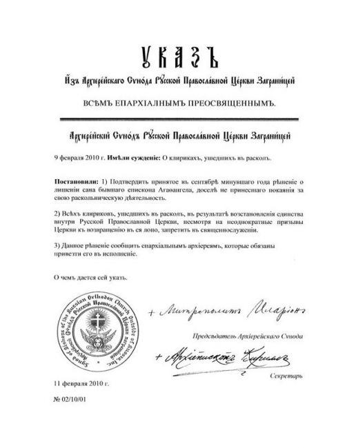 Now let’s turn our attention to the letter of the ROCOR episcopate signed by Metropolitan Laurus and a number of other hierarches. In this letter addressed to the head of the Bulgarian Old Calendarists, the hierarchy of ROCOR recalls that there is a certain opposition to the process of reunification of the ROC and ROCOR. In the text are named three leaders of the movement that is opposing the unification with the ROC. And two of the three are the figures now known to the reader: Bishop Agafangel Pashkovsky is in first place, and in third place is the U.S. intelligence colonel Evgeny Magerovsky, who was his trusted helper.