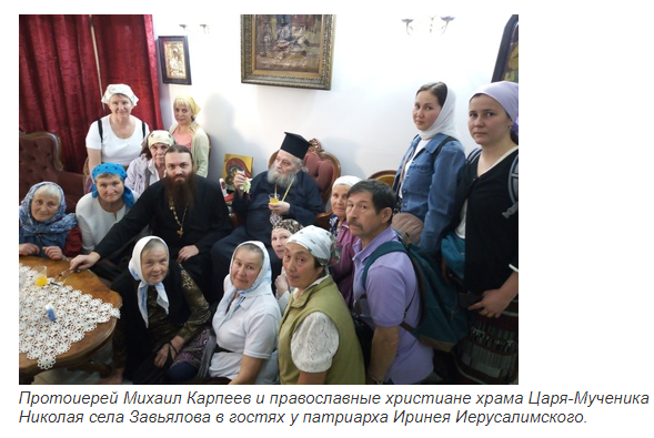 “Archpriest Mikhail Karpeyev and Orthodox Christians from the Church of the Tsar Martyr Nicholas, Zavyalov village, visiting Patriarch Ireneus of Jerusalem.”